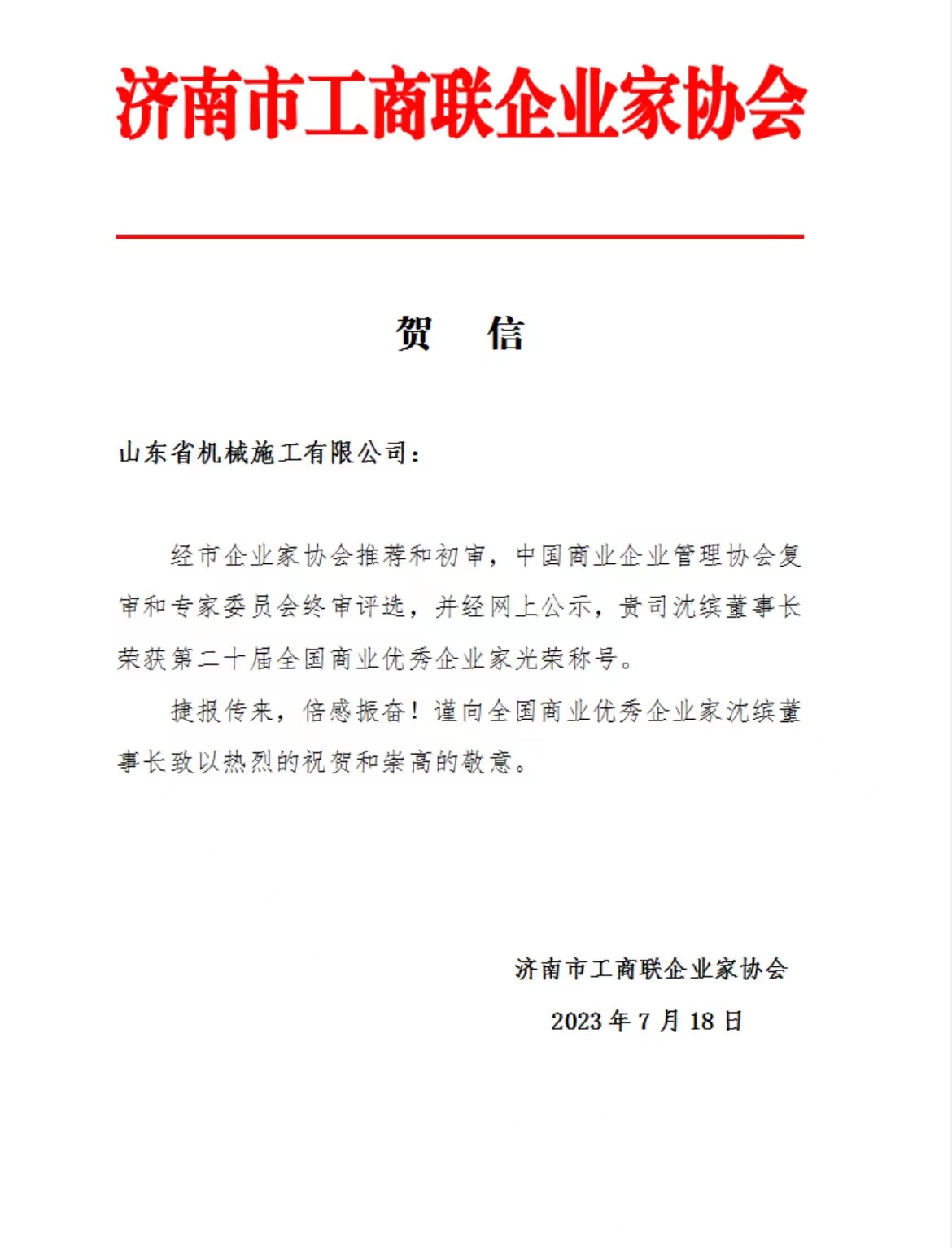 7月18日,山東省機(jī)械施工有限公司沈繽董事長(zhǎng)憑借在業(yè)內(nèi)取得的突出成績(jī)和做出的杰出貢獻(xiàn),經(jīng)濟(jì)南市工商聯(lián)企業(yè)家協(xié)會(huì)推薦和初審,中國(guó)商業(yè)企業(yè)管理協(xié)會(huì)復(fù)審和專家委員會(huì)終審評(píng)選,并經(jīng)網(wǎng)上公示,繼2020年榮獲“全國(guó)商業(yè)優(yōu)秀企業(yè)家獎(jiǎng)”后,再次榮獲“全國(guó)商業(yè)優(yōu)秀企業(yè)家”光榮稱號(hào)。