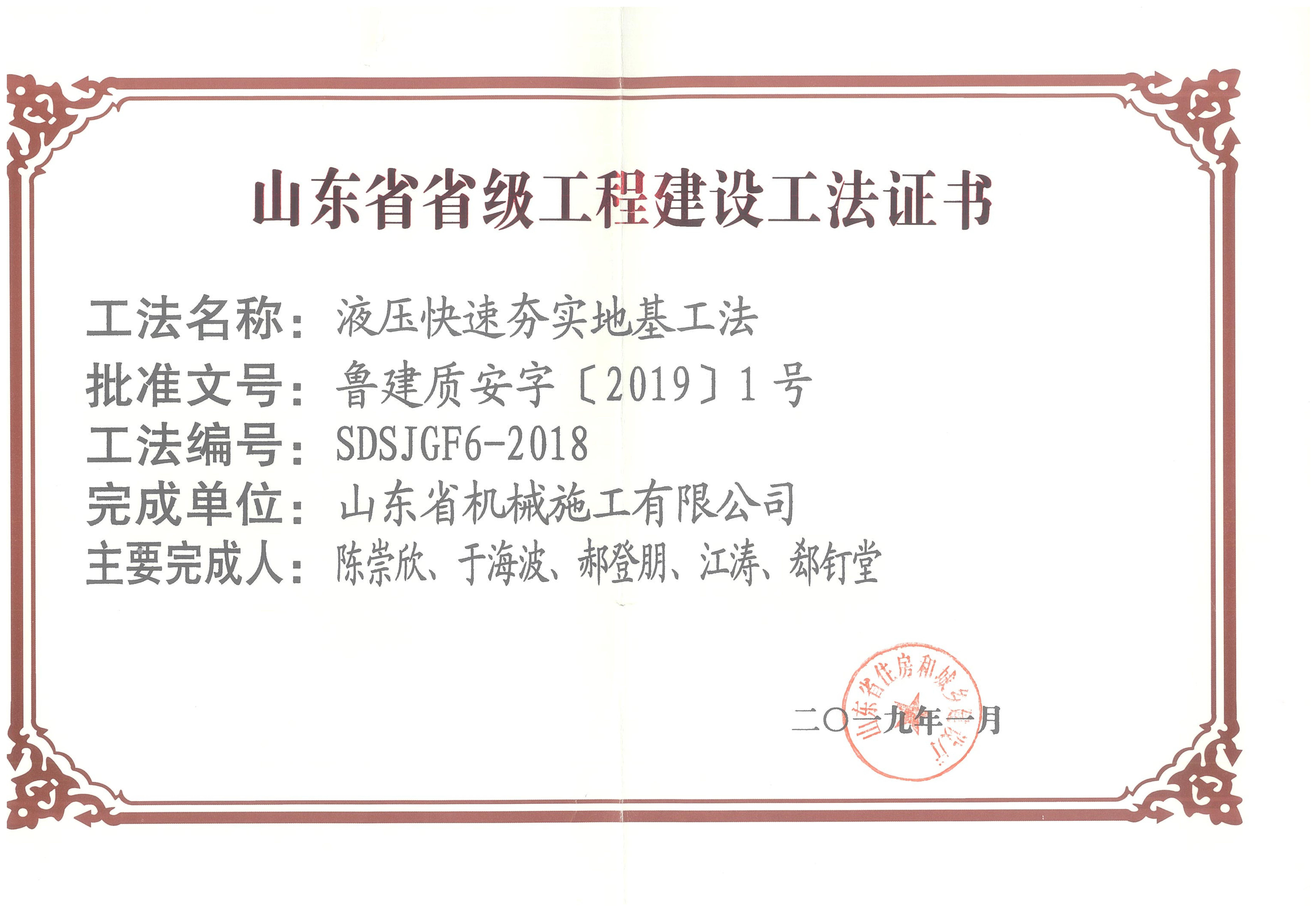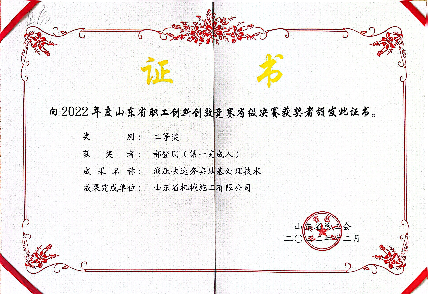 近日,山東省機械施工有限公司的創新技術《液壓快速夯實地基處理技術》被濟南市總工會直屬工會推薦為“全省職工優秀創新成果入庫孵化轉化集中行動”入庫項目。