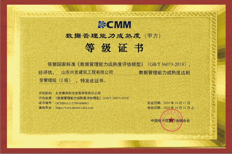 【喜訊】山東省機械施工有限公司(山東興發建筑工程有限公司)成功斬獲數據管理能力成熟度(DCMM)2級認證!